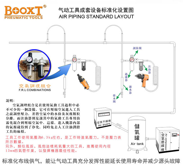 防銹:壓縮空氣,如果按標(biāo)準(zhǔn)布線,雖然在經(jīng)過機(jī)房的干燥機(jī)、現(xiàn)場終端的空氣調(diào)理組過濾以后,仍然會殘存水氣的可能。而大部件的氣動工具馬達(dá)由鋼制或鐵制部件構(gòu)成,這些水氣進(jìn)入氣動工具馬達(dá)內(nèi)部之后,如果沒有氣動油來保護(hù)這些部件,不將水氣沖洗出機(jī)器外部,這些部件就極易生銹,從而給機(jī)器造成各種故障。