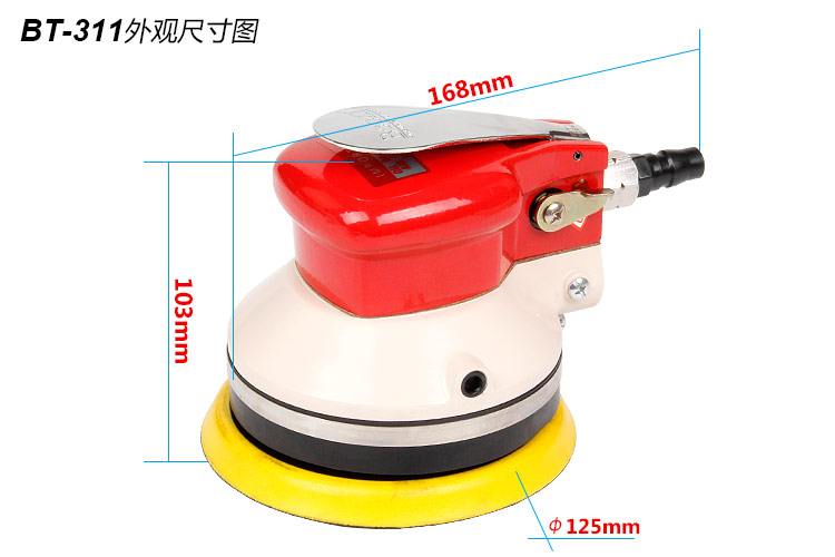 • 產(chǎn)品參數(shù): 底盤(pán)尺寸:125mm 【5寸】 空載轉(zhuǎn)速:10000rpm 偏擺直徑:5mm 重 量:1.24kg 耗 氣 量:0.48m3/min(重型粗磨)
