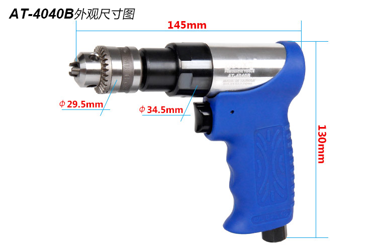 • 產(chǎn)品參數(shù): 夾頭尺寸:1.0-6.5mm 【1/4"】 馬達(dá)功率:0.3hp 空載轉(zhuǎn)速:2800rpm 全 長:145mm 重 量:0.70kg 耗 氣 量:0.5m3/min 【單向設(shè)計/工業(yè)型】