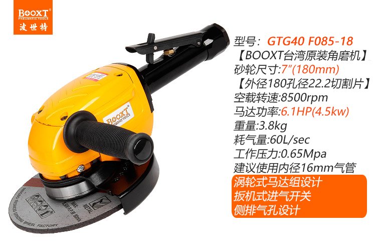 東莞市強勁五金工具有限公司提供臺灣BOOXT波世特品牌氣動工具,渦輪式氣動角磨機GTG40 F085-18廠家直銷,首件享特價。咨詢熱線:4008301980