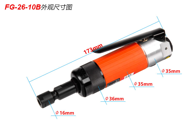 • 產(chǎn)品參數(shù): 夾頭能力:M3,6 (標(biāo)配M6) 馬達(dá)功率:0.35HP 空載轉(zhuǎn)速:24000rpm 工具能力:砂輪磨頭M25,旋轉(zhuǎn)銼刀M13 耗 氣 量:0.4m3/min 全 長:173mm 重 量 : 0.5kg 噪 音 值:83db(A) 【工業(yè)型/扳機(jī)開關(guān)】